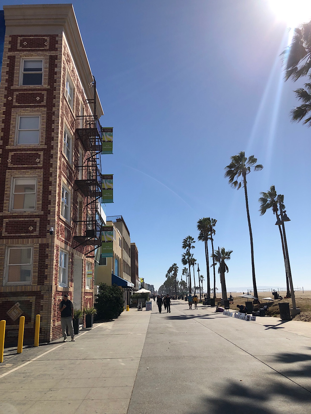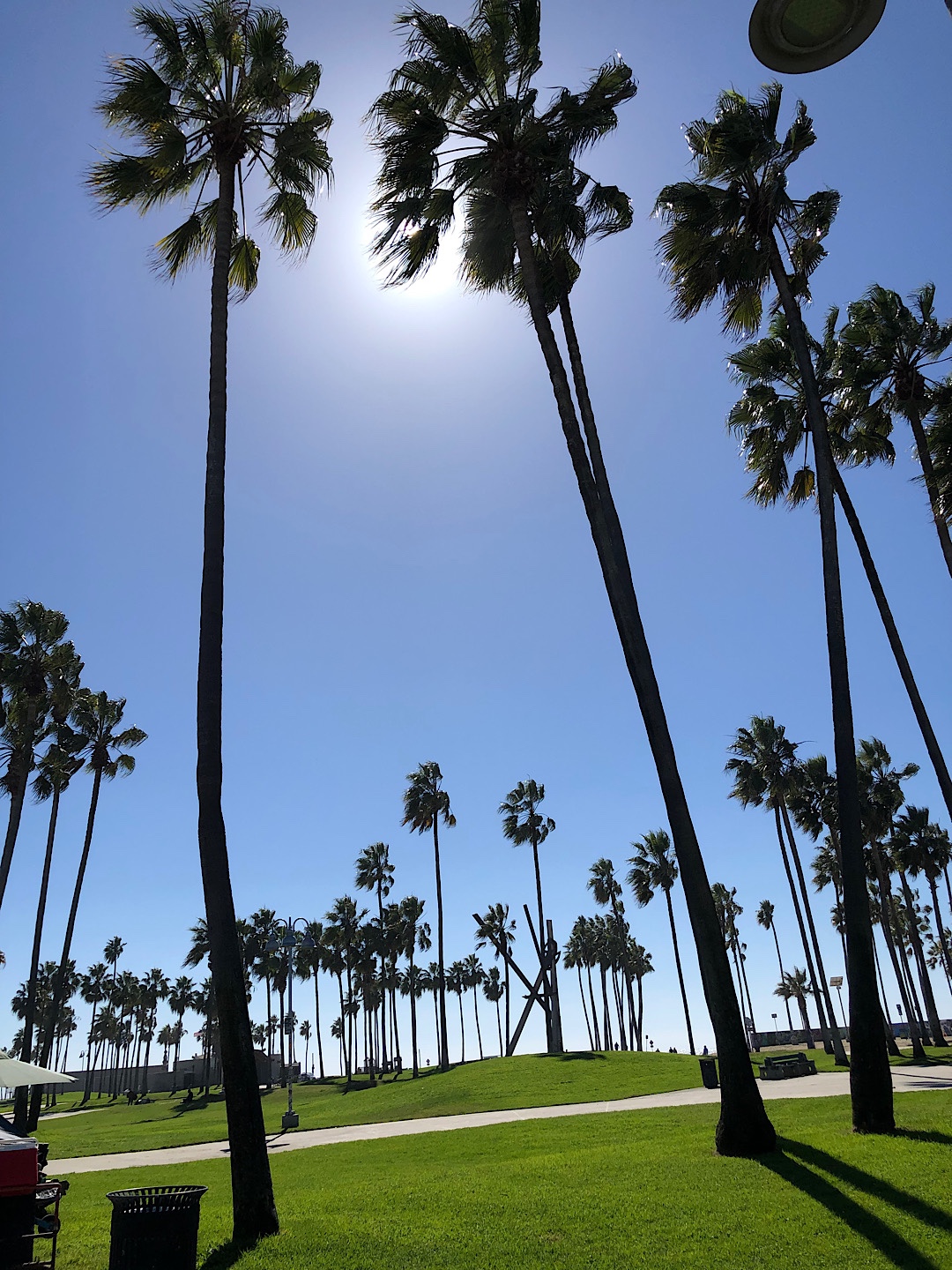 Comme le soleil était au rendez-vous, on a décidé d’aller à pied jusqu’à Venice Beach. Il nous a fallut plus d’1h pour rejoindre Venice Beach et ses canaux. Mais la balade est très agréable, le long de la plage sur le chemin piéton, bétonné, antidérapant. On y croise des joggeurs, des cyclistes, des patineurs, des skateboardeurs, et tout un tas de gens musclés car il ne faut pas oublié qu’on est dans la ville du culte du corps. De nombreux terrains de sport longent la plage à Muscle Beach, Volley-ball, Paddle, Basket-ball, Musculation et pleins de terrains de jeux pour les enfants.